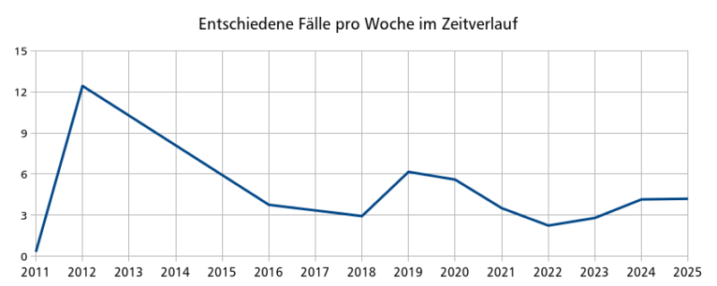 Durchschnittliche Anzahl der Fälle pro Zeiteinheit, zeigt den Verlauf von intensiveren und weniger intensiven Phasen.